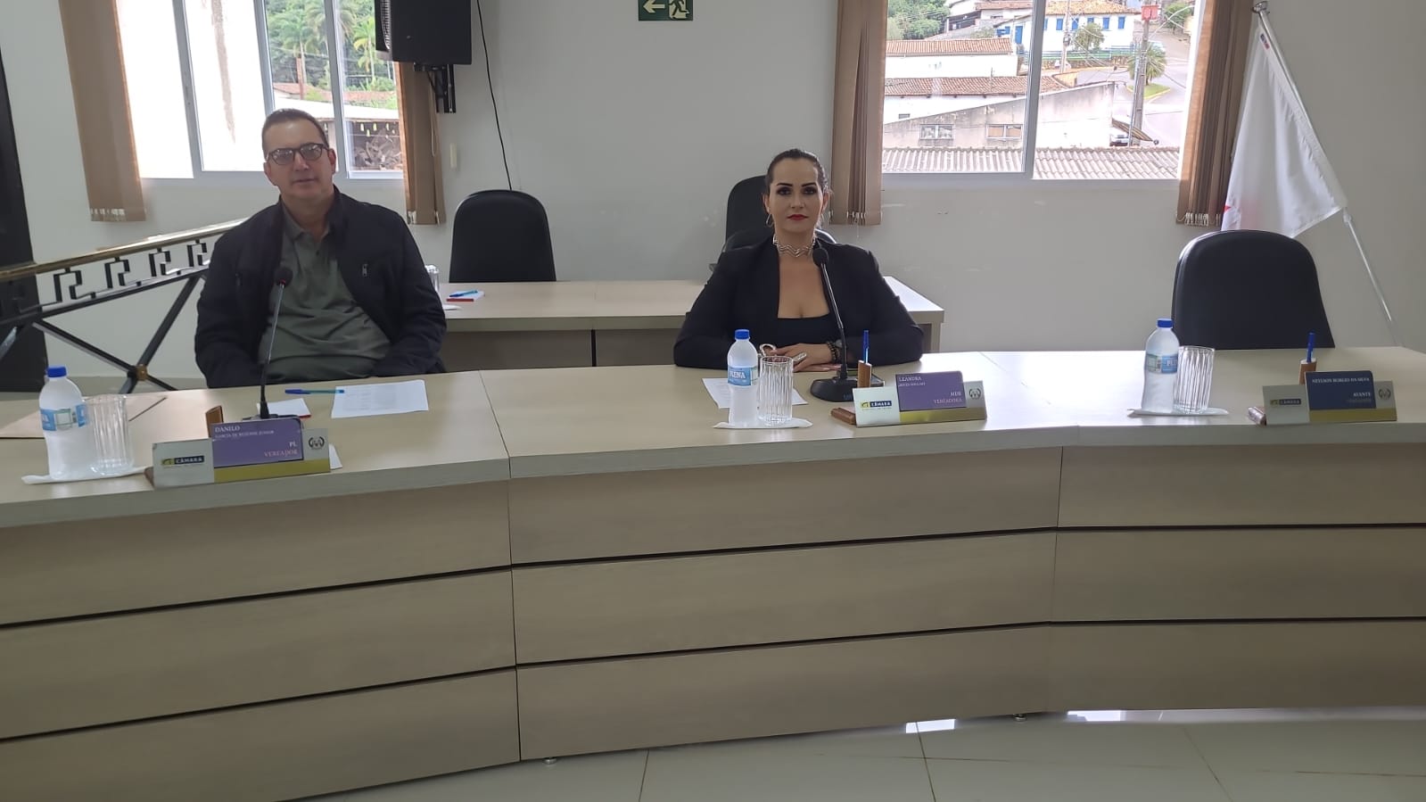 A foto mostra os vereadores Juninho das Palmeiras e Leandra.
