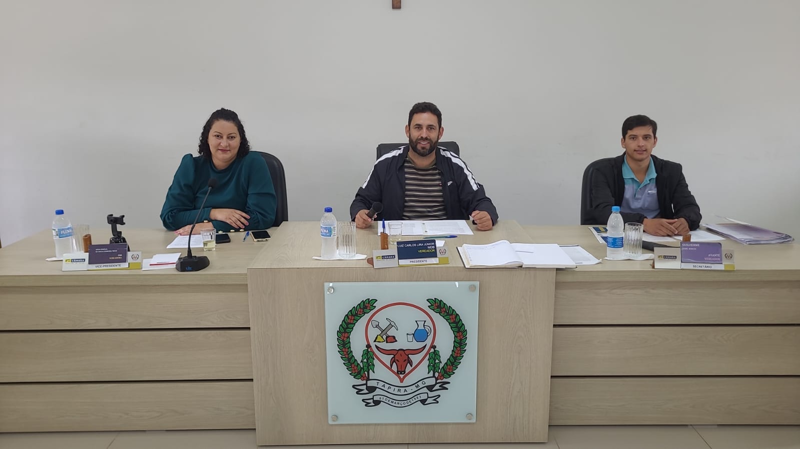 Foto da mesa diretora da Câmara, antes da reunião extraordinária, composta por, da esquerda para a direita, os vereadores Ana Paula, Luiz Carlos e Guilherme Jamil, olhando para a Câmera.