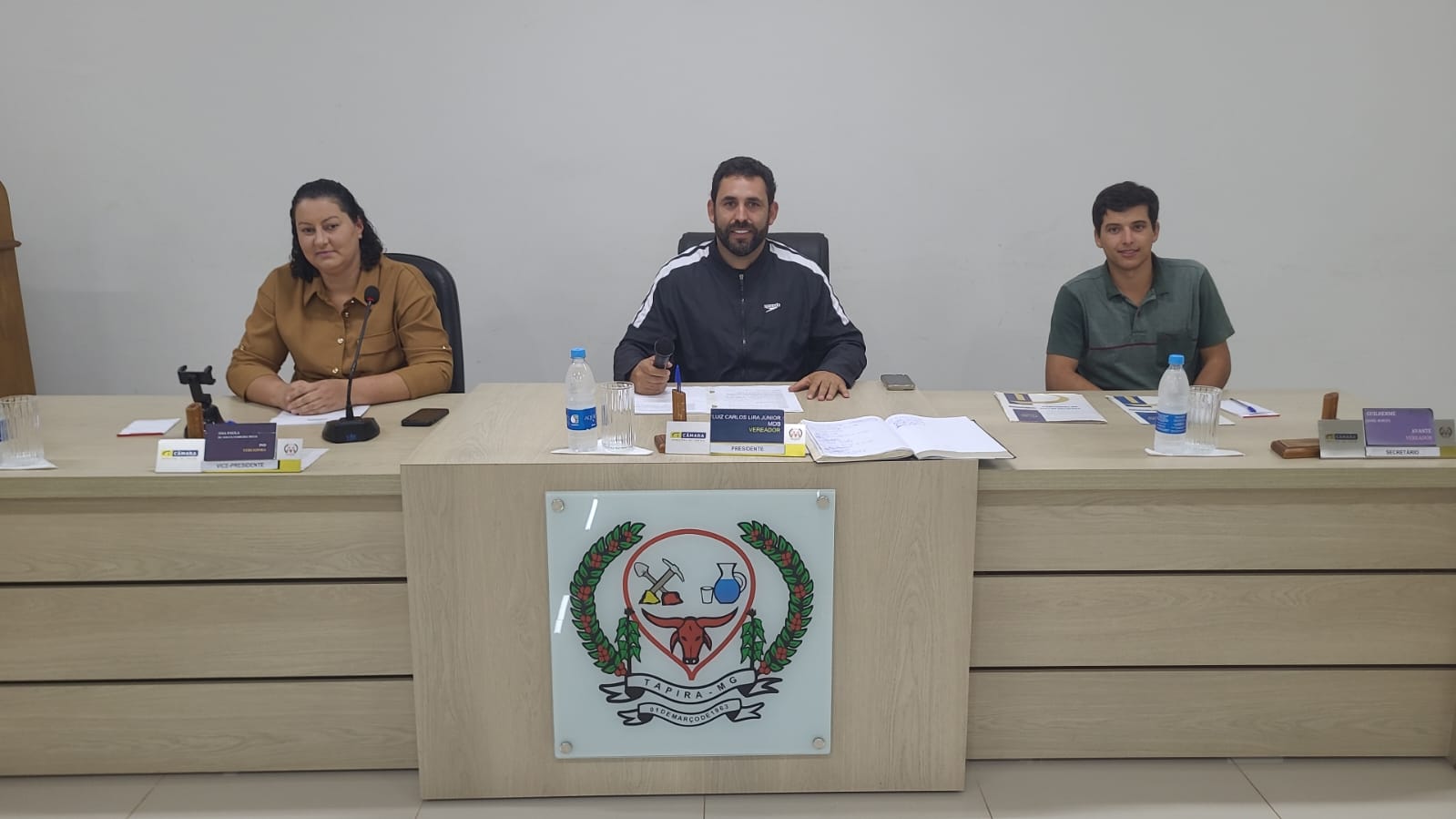 Foto da mesa diretora, com os vereadores Ana Paula, Kaká e Guilherme, olhando para a câmera, antes da reunião.