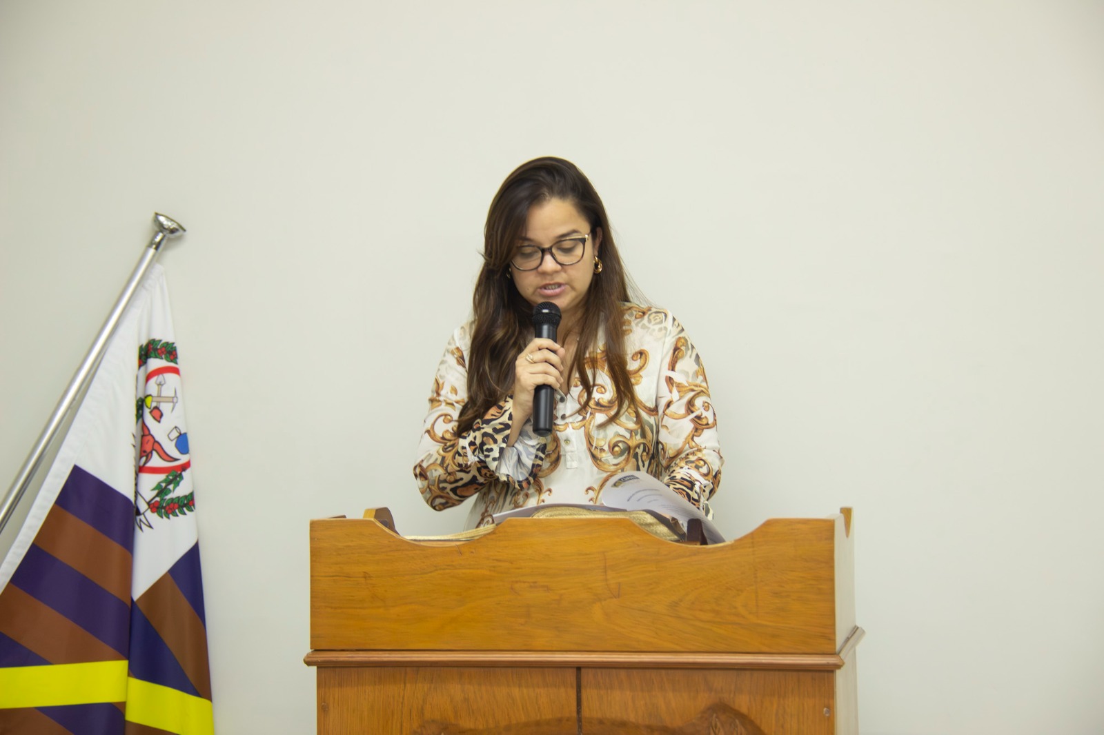 Vereadora Maria Eduarda, em seu uso da tribuna, lendo a moção de congratulações